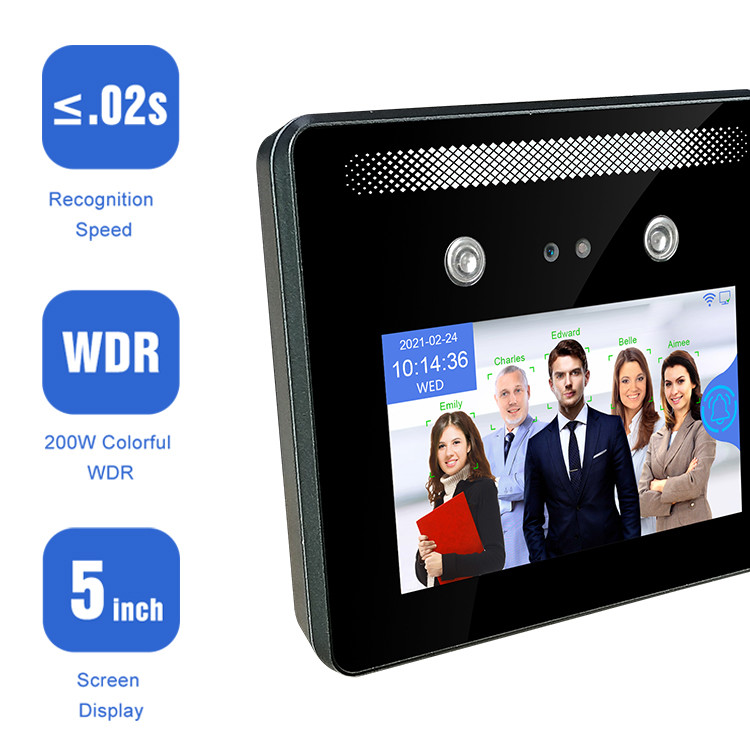 Wanneer het een machine van de tijdopkomst werkt, kan het gezicht steunen, rfid kaart en het wachtwoord, de methode van de QR-codeidentificatie, ook zijn horizontaal de vertoningsontwerp van het 5 duimscherm kan toestaan de controle van het 5 personengezicht in het scherm en opsporing toont. AI05 het apparaat keurt WDR-technologie goed, kan het goed in de heldere zonlichtbezinning werken. Wanneer AI05-het Apparaat een toegangsbeheermachine werkt, kan het maskeropsporing, en de beperking van de tijdzonetoegang voor bepaalde persoon of bepaalde tijdspanne steunen. welke de toegang met gezagsbeheer kan controleren.