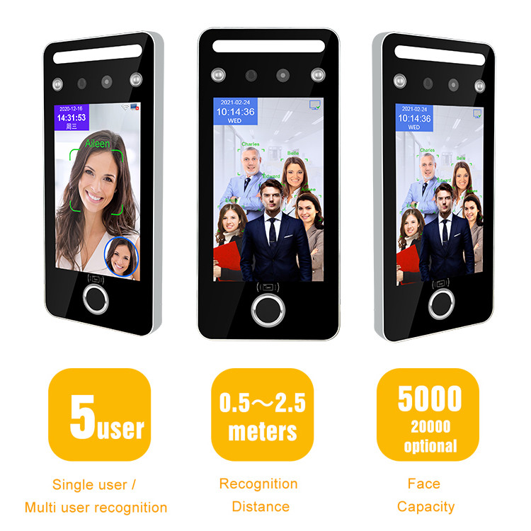 De verbeterde Zichtbare Lichte Gezichtserkenning met heldert leiden op. De gemaskeerde individuele identificatie stijgt VER. Veelvoudige controlemethodes: Gezicht/Vingerafdruk/Kaart/Wachtwoord. Ingebouwde identiteitskaart-lezer van 125KHz, kaart de Facultatieve van 13.56MHz IC (MF). Professionele Web gebaseerde beheerssoftware. Vrij SDK voor integratie ............