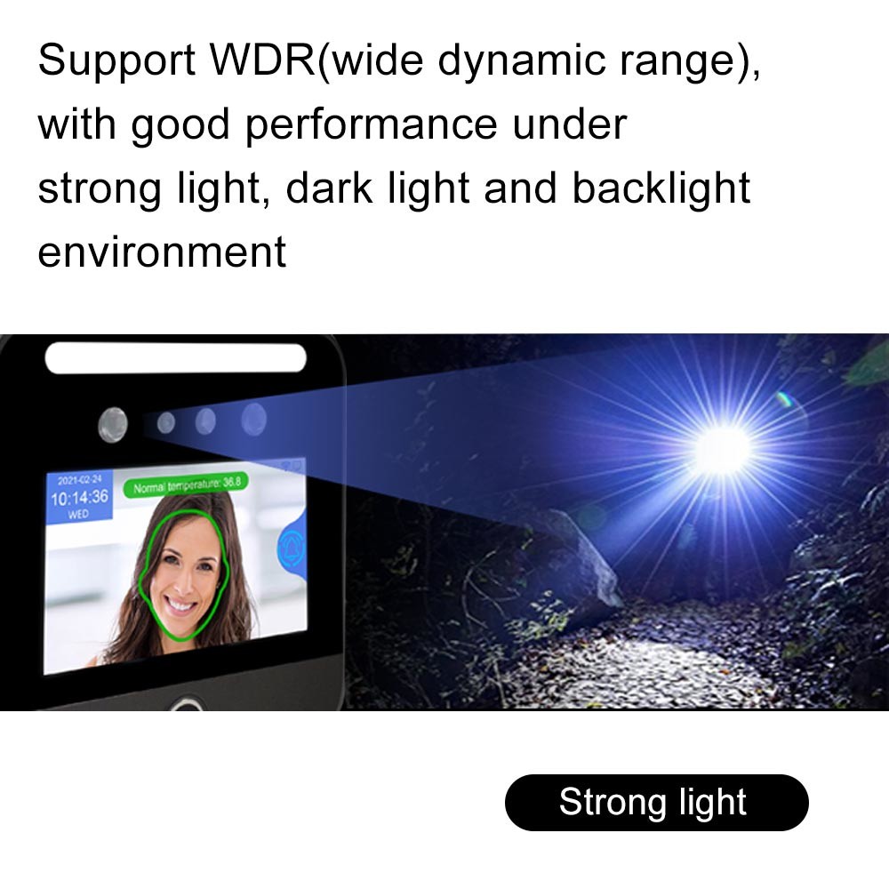De verbeterde Zichtbare Lichte Gezichtserkenning met 6 stukken van heldert leiden op. Steun WDR met goede prestaties onder sterk licht, donker licht en backlight milieu. Veelvoudige controlemethodes: Gezicht/Vingerafdruk/Kaart/Wachtwoord. Ingebouwde identiteitskaart-lezer van 125KHz, kaart de Facultatieve van 13.56MHz IC (MF). Professionele Web gebaseerde beheerssoftware. Erkenningsafstand: 0.5-2.5 meters.