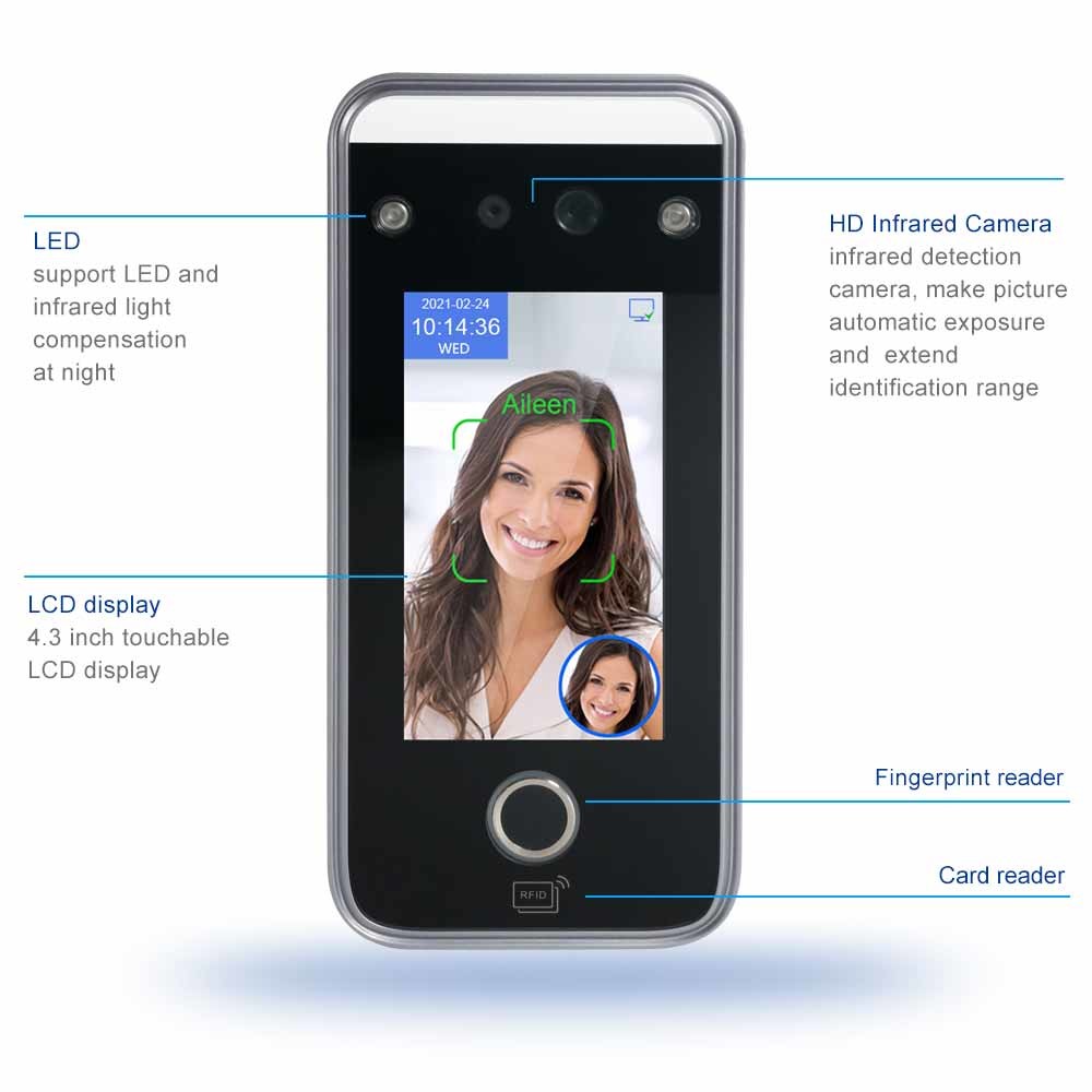 5 duimips HD touch screen, beeldschermresolutie: 1280*720. De dynamische gezichtserkenning, rfid card/ic-kaart is facultatief, steunwachtwoord, gezicht als identificatie.